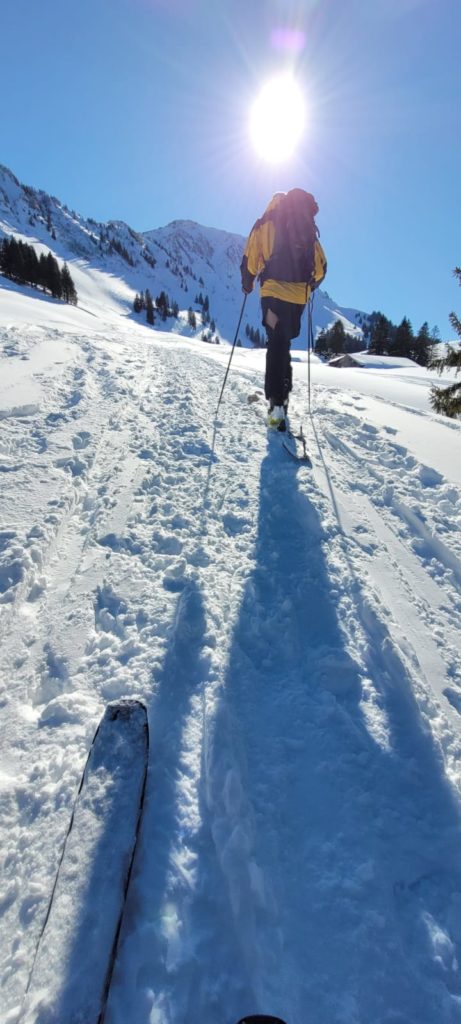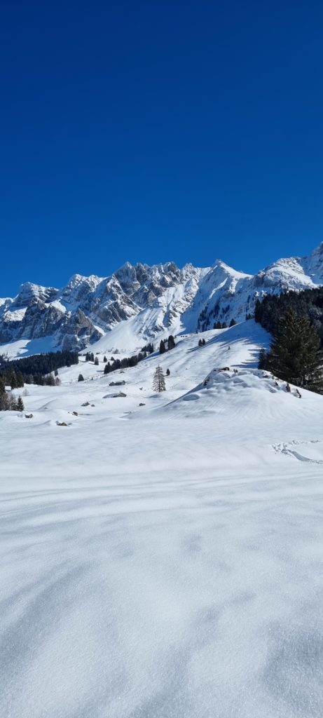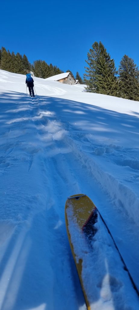 Der Stockberg beziehungsweise sein kleiner Burder, der Chli Stockberg sind zwei super kleine Skitouren Berge im Alpstein. Parkplatz gibt es an der Haltestelle Lutertannen, erreichbar von der Passstraße auf 1030 m. Von hier aus folgt man dem Weg nach Latten, über Glattdach nach Riet auf P. 1288 m. Hier kann man sich entscheiden ob man weiter zum Risipass und auf den Stockberg möchte, oder ob man die Tour abkürzt und auf den Chli Stockberg läuft. Bei letzerem biegt man hier nach Westen in Richtung Langzimmer ab und passiert die Hütte auf 1423 m westlich.